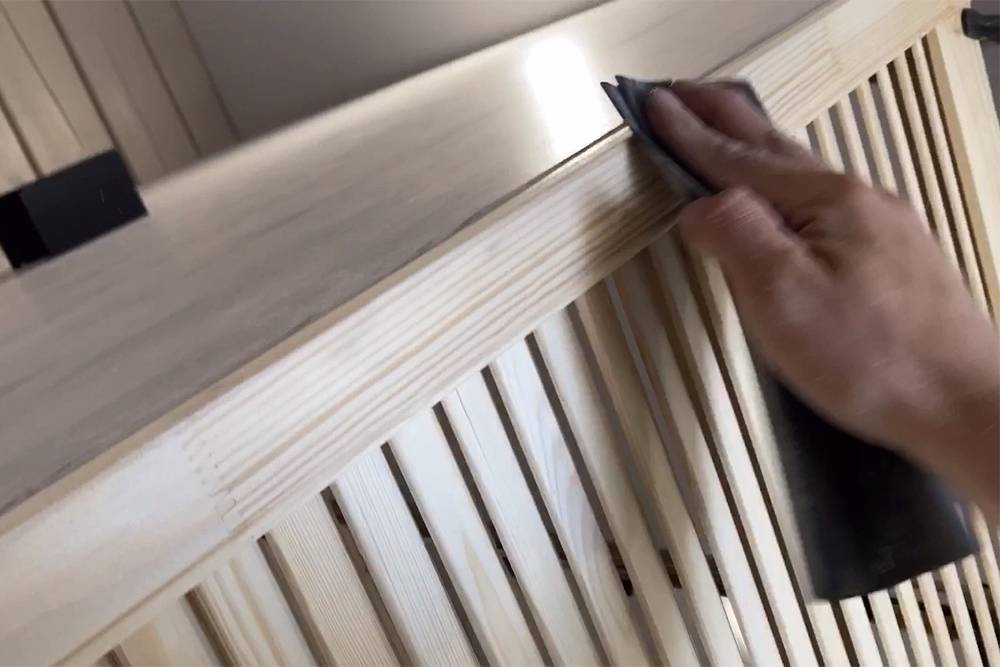 - Приступаем к распилу ламинированного ДСП. Этот материал считается оптимальным для изготовления самодельного стеллажа. Он не боится влаги и обладает высокими показателями прочности. Кроме того, плиты выглядят эстетично, имитируя деревянную поверхность. Распил производится электролобзиком с применением острых пилок для ДСП. Необходимо увеличить обороты, сократить подачу и выставить подкачку в 0. Ещё более простое решение – произвести распиловку в магазине при покупке материала. Шероховатость на краях убираем наждачной бумагой.