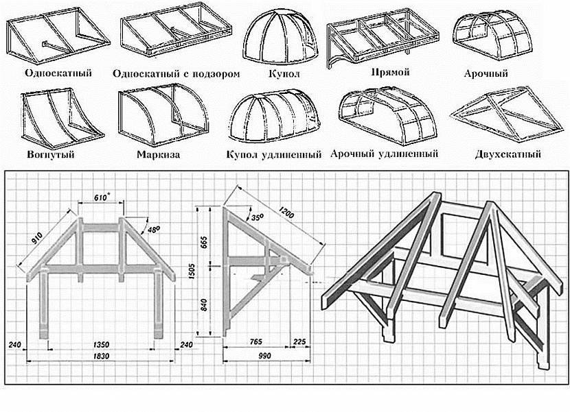 Козырьки бывают односкатными, двускатными, арочными и шатровыми. У всех конструкций есть свои преимущества, но чаще всего используют двускатные и арочные варианты. Кроме того, каркас козырька можно сделать из металла или дерева. Металлический надежнее и изящнее, деревянный экологичен и делается без сварки.