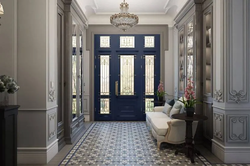 - Ампир. Подходит для узкой и длинной прихожей. В стиле ампир она будет смотреться выразительной и яркой. При оформлении применяют смелые, насыщенные оттенки, к примеру, красный, золотой, зеленый, синий. Обставлять помещение надо соответствующим декором.