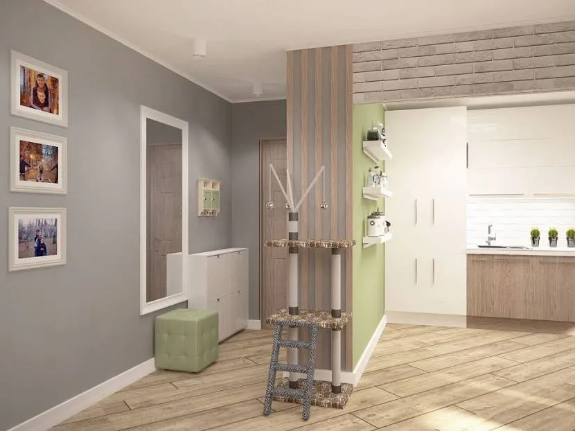 Ахроматическая серая гамма в комбинации со спокойными оливковыми цветами зрительно не уменьшит прихожую и не нарушит общее восприятие интерьера.
