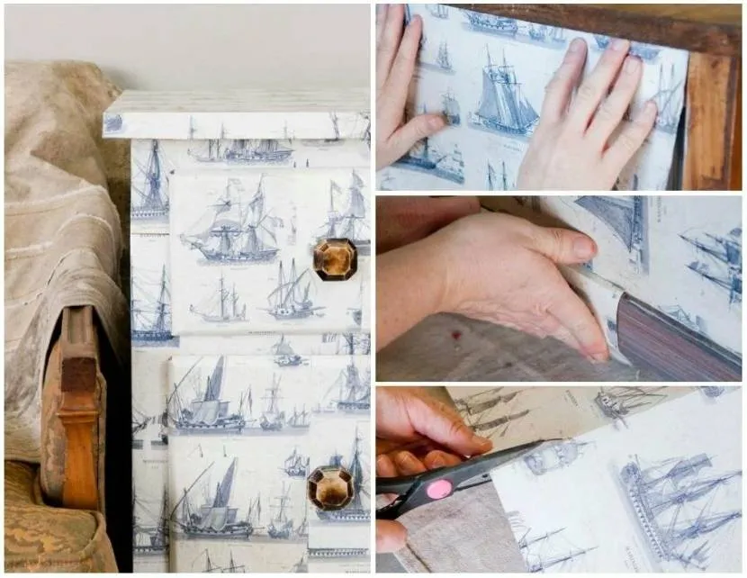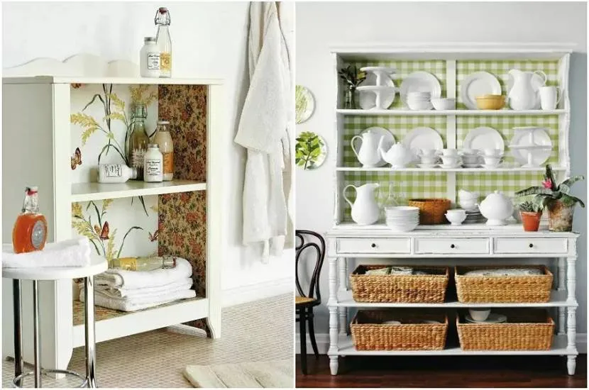 Остатки обоев предоставят второй шанс старым предметам мебели, сделают их нарядными и стильными. Оклеивать можно любые поверхности: открытые полки стеллажа, фасады шкафа, выдвижные ящики комода (их декорируют разными способами: по фасаду, внутри и по боковым внешним поверхностям).