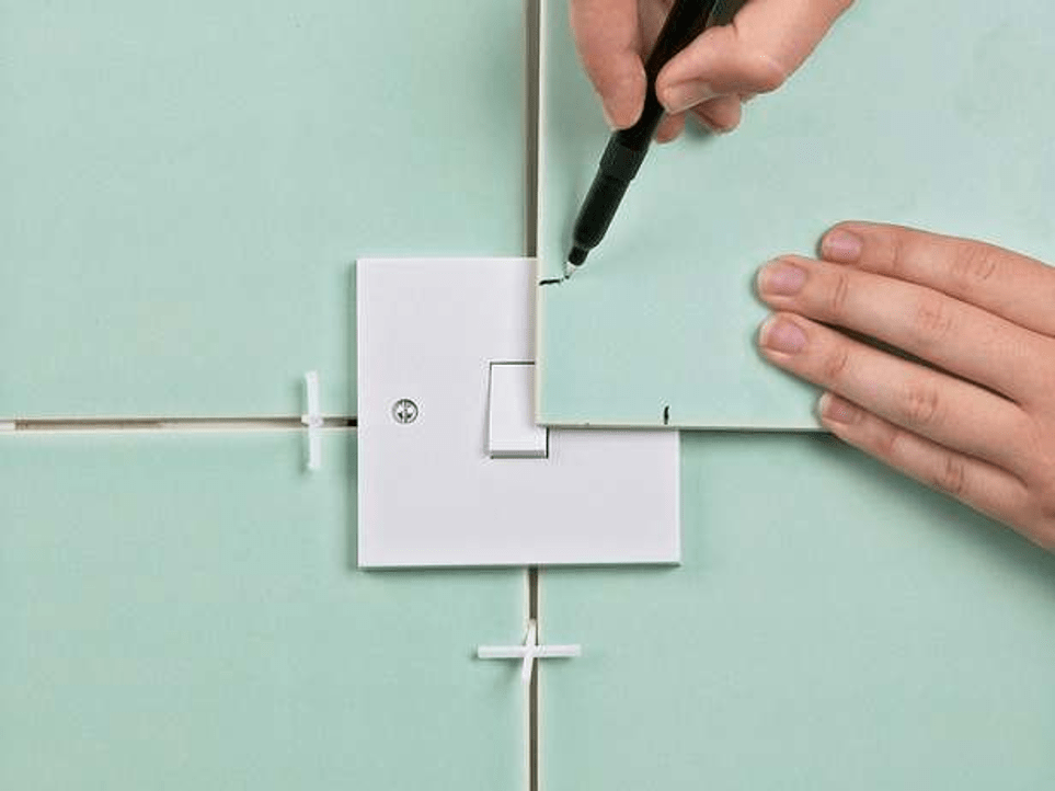 Обратите внимание: разметка отверстия под розетку делается так, чтобы размеры отверстия были меньше, чем внешний контур электрического изделия, то есть накладка должна скрывать края обрезов плитки.