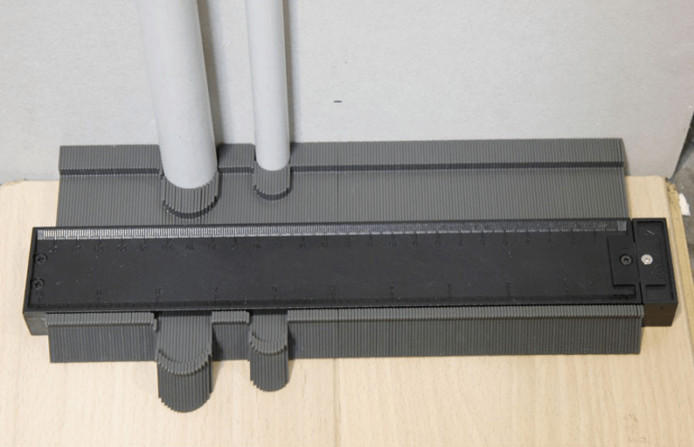 Такое вот приспособление — шаблон для копирования форм 250 мм EDMA DUPLIC FORM 088255 – позволит с легкостью перенести на плитку сколь угодно сложный контур и точно сделать отверстие в плитке под трубу (трубы, выступы стены и прочие элементы).