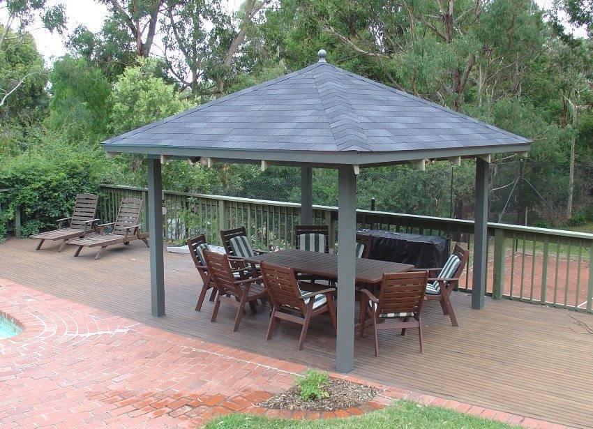 А если беседка примыкает к стене дома, обрати внимание на односкатные решения