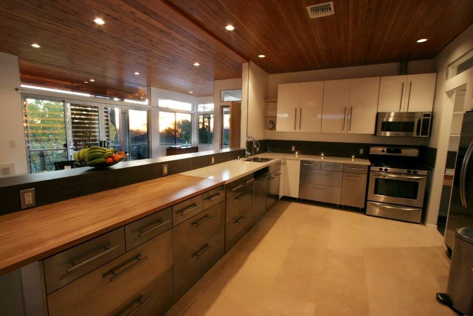 П-образное размещение мебели и бытовой техники подойдет только в том случае, если ширина кухни составляет, минимум, 3 метра. Самый распространенный вид у хозяек, когда мойка находится рядом с окном. Чтобы можно было мыть посуду и смотреть в окна на кухне своего частного дома. Это мечта любой хозяйки
