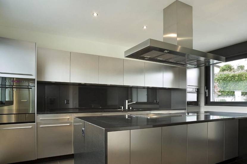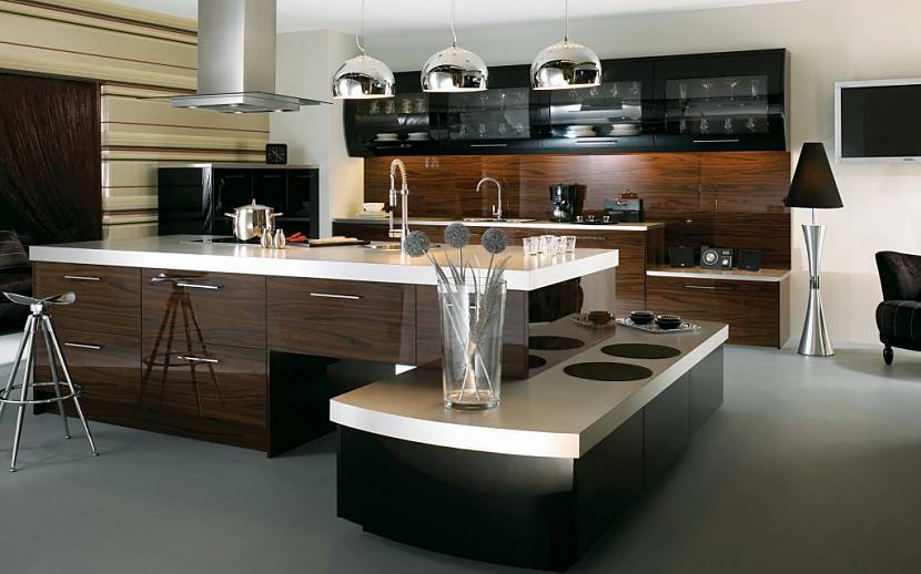 Мебельный гарнитур можно сделать на заказ. Если позволяет место, предпочтителен гарнитур не прямой, а П или Г-образной формы — так пространство будет выглядеть более аккуратно. Мебель не обязательно должна быть глянцевой. Если в дизайне уже предусмотрен глянцевый потолок и лакированный ламинат (глазурованная плитка) на полу, для отражения света этого будет целиком достаточно.