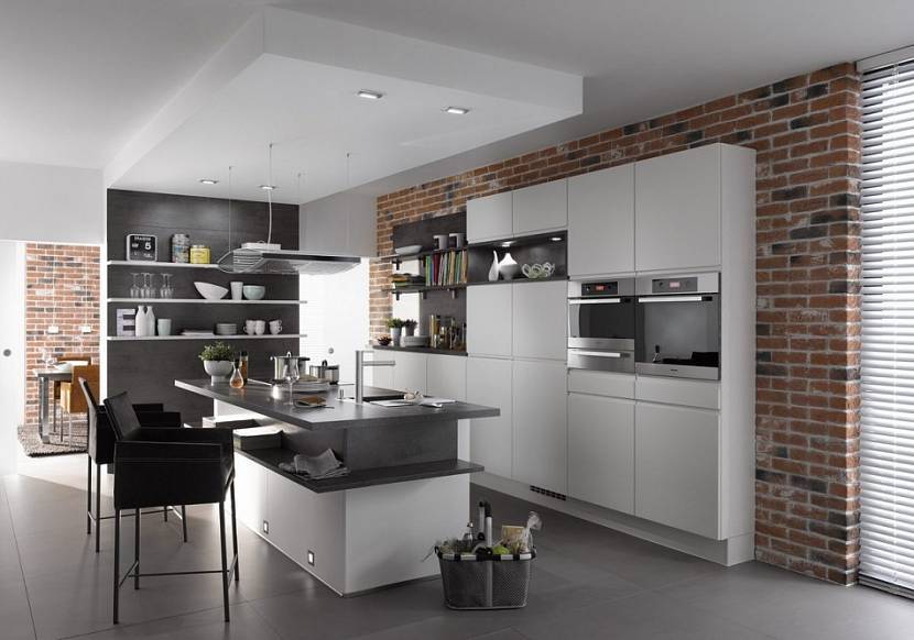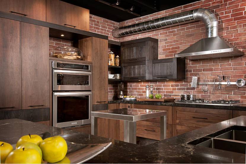 Для загородных кухонь используется редко. Приветствует стены из кирпича, обработанные по минимуму, декоративную штукатурку, имитирующую бетон.