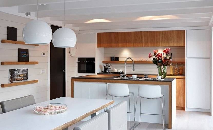 Стиль приветствует светлое дерево для мебели и пола (ольху, сосну, липу, ясень), глянцевые фасады с минимумом декора. В качестве цветовых акцентов применяют оливковый, оранжевый, желтый цвета.