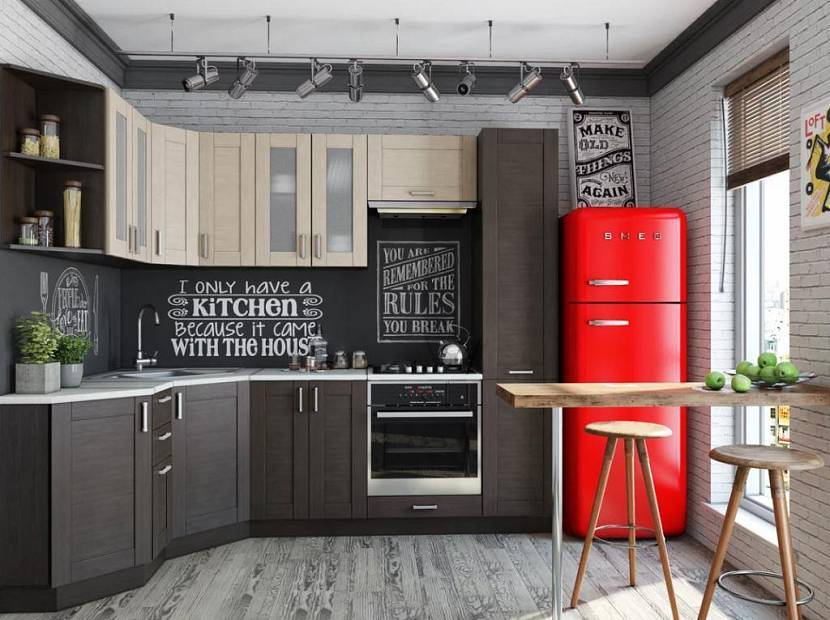Невероятно притягательная и изысканная кухня лофт с ярким пятном — алым холодильникомИсточник yandex.ru