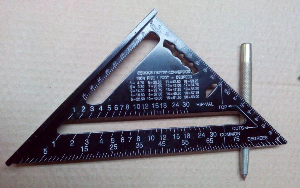 Внутри слесарного приспособления есть прорезь, расположенная параллельно гипотенузе для разметки угла кровли. С противоположной стороны инструмент имеет выемку в форме прямоугольного треугольника, с гребенкой для параллельной и продольной разметки.