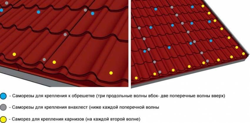 Схема крепления листов металочерепицы и размещения саморезов