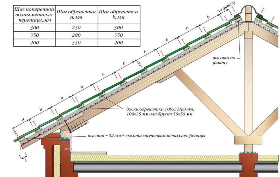 Шаг обрешетки — это расстояние между продольными центрами двух смежных досок. Он должен равняться длине волны выбранной модели металлочерепицы. На рисунке ниже это четко видно.
