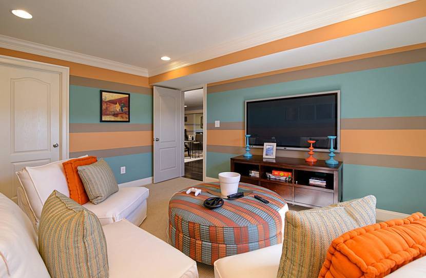 - Покрытие стен также поможет расширить узкую комнату. Смело используйте горизонтальную полоску на торцевых поверхностях. Широкие полосы и умело подобранные цвета помогут усилить эффект расширения.