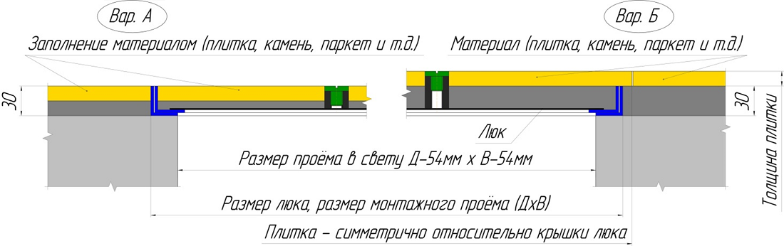 Напольные люки в основном имеют глубину 54мм и 30 мм. Первый вид люков здорово подходит для заполнения или облицовки плиткой, зависит от того стоит ли на нем заполняемое «корыто». Крышка такого люка без проблем выдерживает серьезные нагрузки, так что с уложенной поверх плиткой ничего не случится.