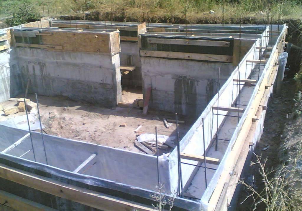 Заливка бетона в готовую опалубку, после его высыхания, производится демонтаж досок. Организация системы дренажа, если получены данные о ближнем залегании грунтовых вод. Для этого нужно заложить специальные трубы ниже уровня основания фундамента. Грунтовка внешней поверхности стен и покрытие их битумной мастикой. Приклеивание на внешние поверхности стен пенополистирола.