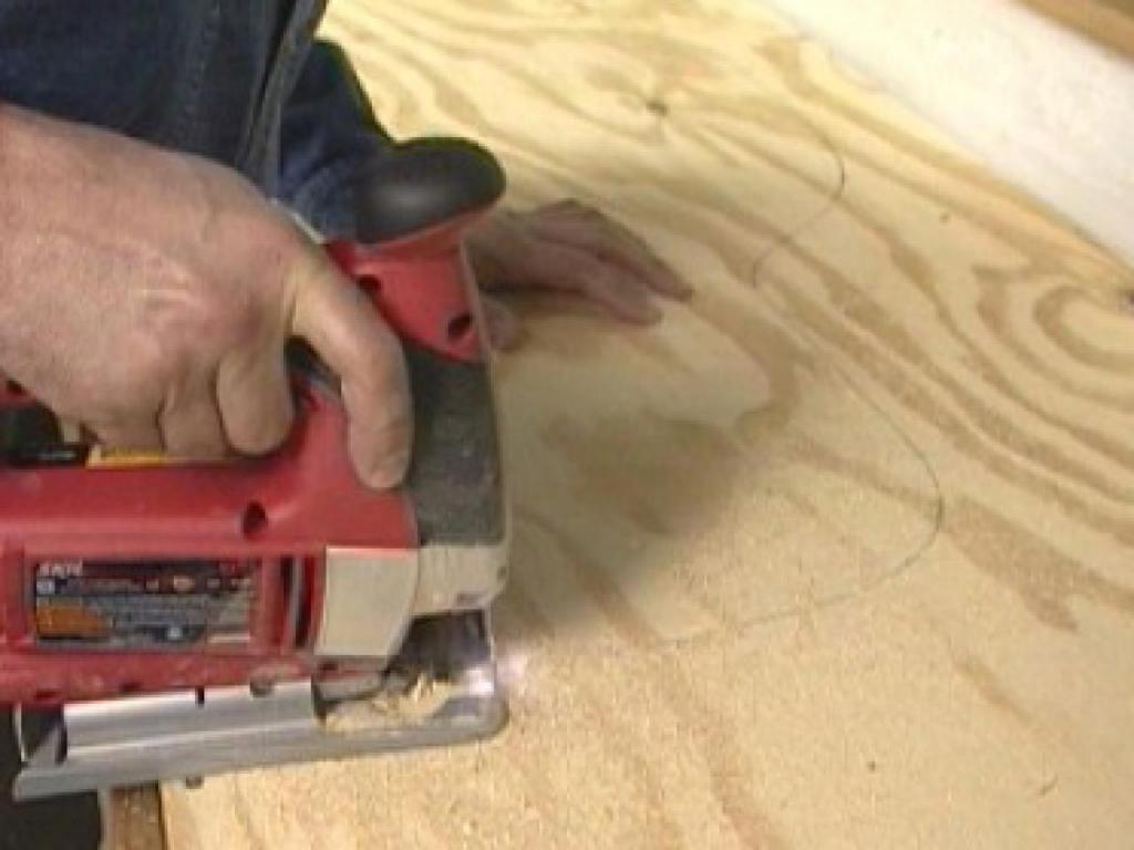 - Вырезать будущее изделие по контуру. Прямые линии формируются с помощью дисковой пилы, сложные фигуры – лобзиком.