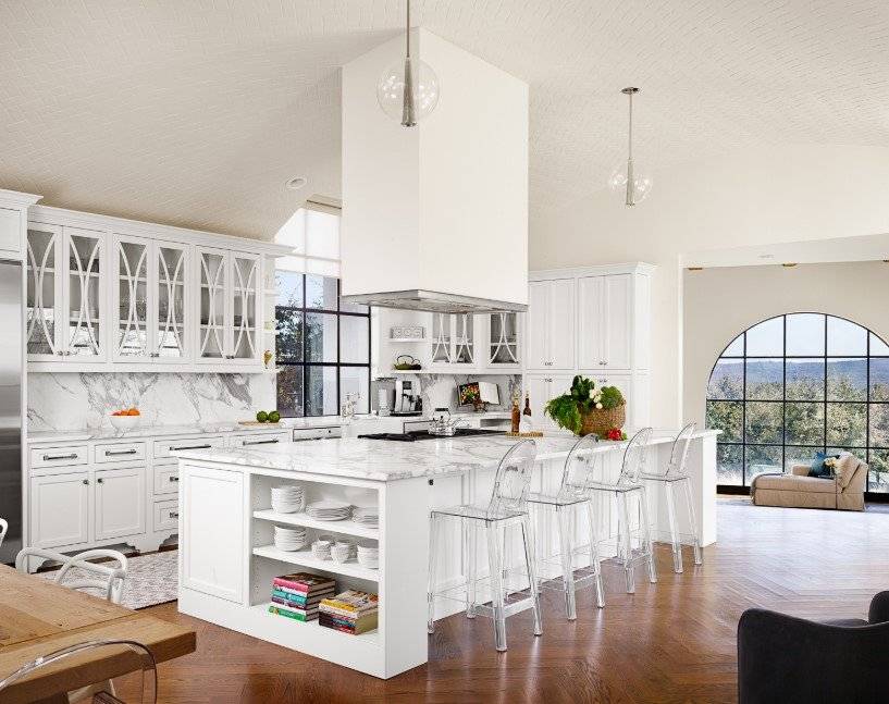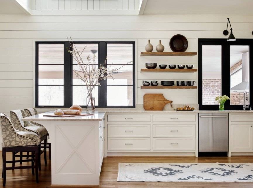 Цена кухонного гарнитура зависит от многих пунктов: материала, внутреннего наполнения, наличия встроенной техники и, конечно, от его размера. На последнем можно сэкономить. Замечали ли вы, как часто на снимках скандинавских кухонь отсутствует верхний ряд шкафов? Их заменяют открытыми полками или рейлингами. Такой вариант подходит не всем: если у вас недостаточно мест для хранения в нижних ящиках или вы — не фанат перманентной уборки (пыль-то на открытых пространствах скапливается быстрее), то лучше все-таки остановиться на классическом варианте со шкафами. Если же вы любите и умеете создавать красоту «на ровном месте», то не бойтесь экспериментов, в конце концов верхние шкафы можно подобрать и повесить позже, если вариант с открытыми полками вам не подойдет. Так сделала дизайнер Ася Бондарева в своем загородном доме.