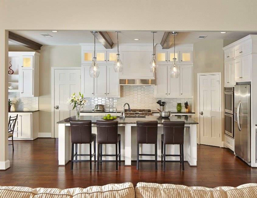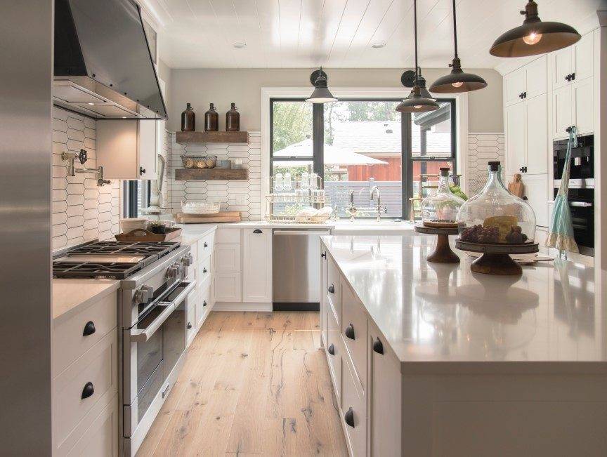 Если невзрачный кухонный пол подводит дизайн, вы можете положить новый пол сверху. Большинство дизайнеров кухни посоветуют вам просто запустить его под плинтусами, а не от стены до стены, что еще больше сократит ваши расходы.