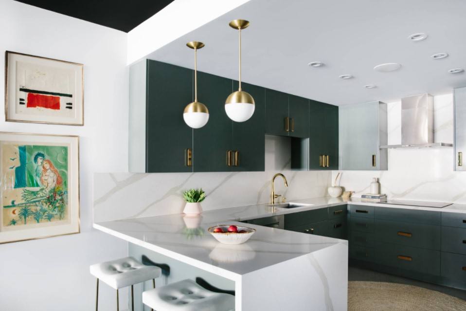 - Обилие света. Разместите точечное освещение по периметру потолка, повесьте над столом и рабочей зоной оригинальные светильники.