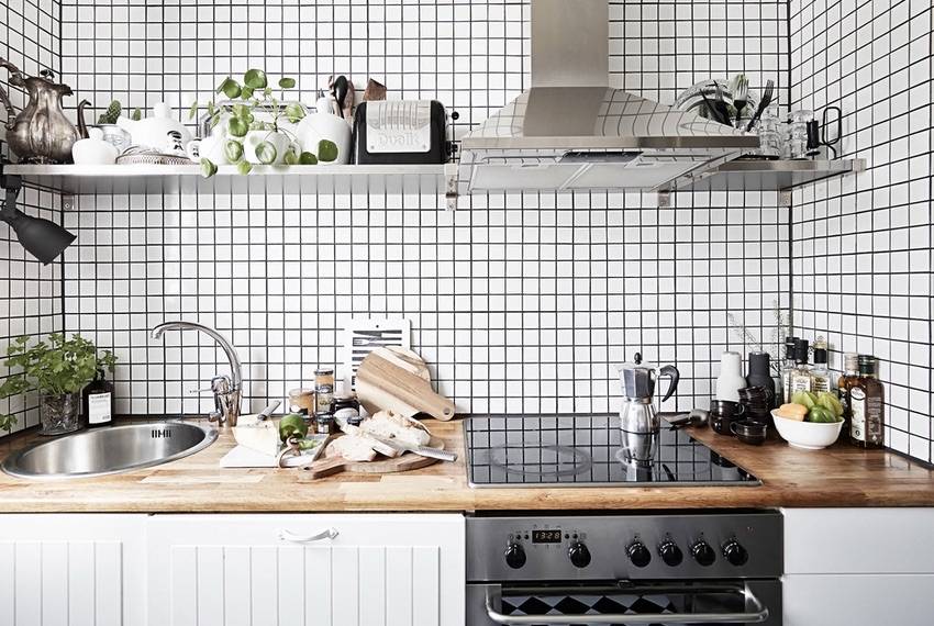 Цена кухонного гарнитура зависит от многих пунктов: материала, внутреннего наполнения, наличия встроенной техники и, конечно, от его размера. На последнем можно сэкономить. Замечали ли вы, как часто на снимках скандинавских кухонь отсутствует верхний ряд шкафов? Их заменяют открытыми полками или рейлингами. Такой вариант подходит не всем: если у вас недостаточно мест для хранения в нижних ящиках или вы — не фанат перманентной уборки (пыль-то на открытых пространствах скапливается быстрее), то лучше все-таки остановиться на классическом варианте со шкафами. Если же вы любите и умеете создавать красоту «на ровном месте», то не бойтесь экспериментов, в конце концов верхние шкафы можно подобрать и повесить позже, если вариант с открытыми полками вам не подойдет. Так сделала дизайнер Ася Бондарева в своем загородном доме.