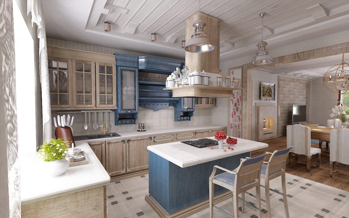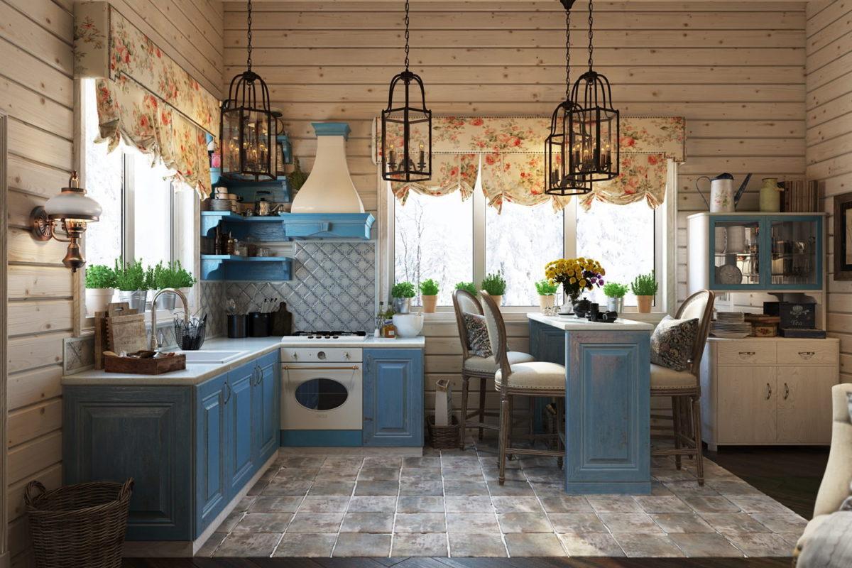 Это направление идеально подходит для загородного жилища. Просторное помещение позволяет грамотно расположить мебель, организовать комфортную обеденную зону. В рабочую часть кухни легко впишется островной стол, увеличив поверхность для готовки.