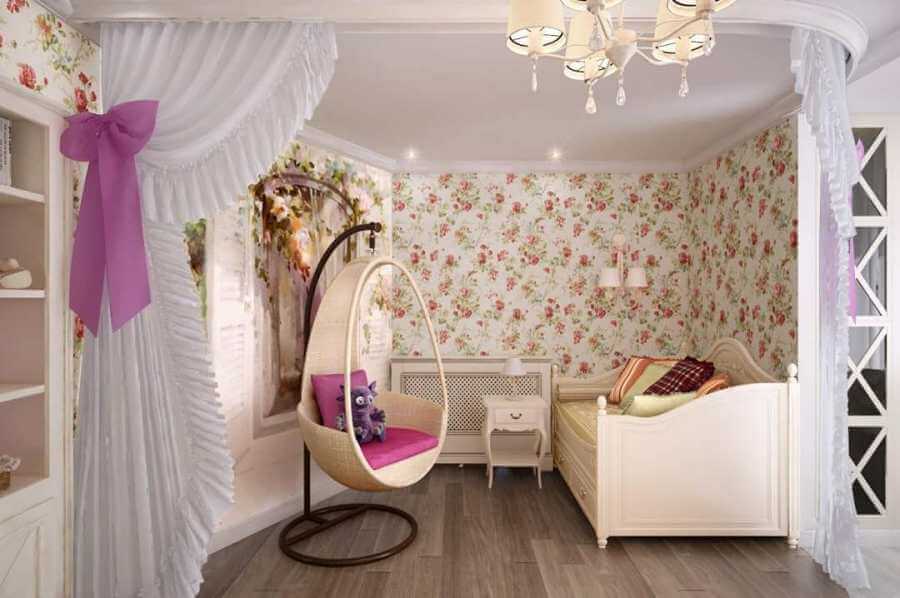 Детская комната в этом оформлении напоминает сказочный домик – уютный, простой и пахнущий деревом. Здесь нет непреложных законов оформления. Используйте деревянные вставки и панели. Мебель, соответственно, тоже деревянная. Стены можно оклеить обоями с чуть видным растительным рисунком или выкрасить в пастельные тона. Отличной идеей будет ручная роспись на стене, будь то герои сказок или же просто сказочный лес со зверушками. На пол лучше положить большой ковер, чтобы ребенку было удобно и тепло играть. Также уместны будут старые яркие игрушки, выставленные на полках в качестве декора.