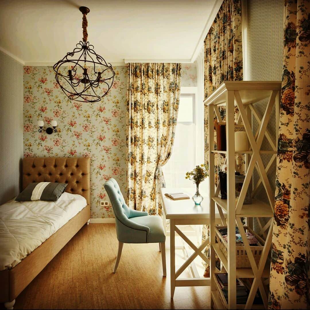- Шторы со сложными складками, драпировками и кружевом. Ткань может быть с принтами, особенно популярны: клетка, растения и птицы. Однако подойдёт и минималистичный вариант – лёгкие, прозрачные и воздушные шторы белого цвета. Есть только одно жёсткое правило: ткани должны быть натуральными.