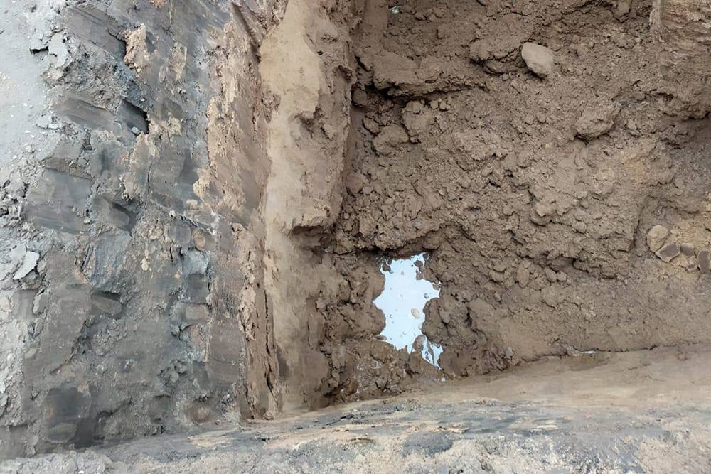 Блестящее пятно на дне ямы — это грунтовая вода. Она стала набираться почти сразу после того, как трактор вырыл котлован