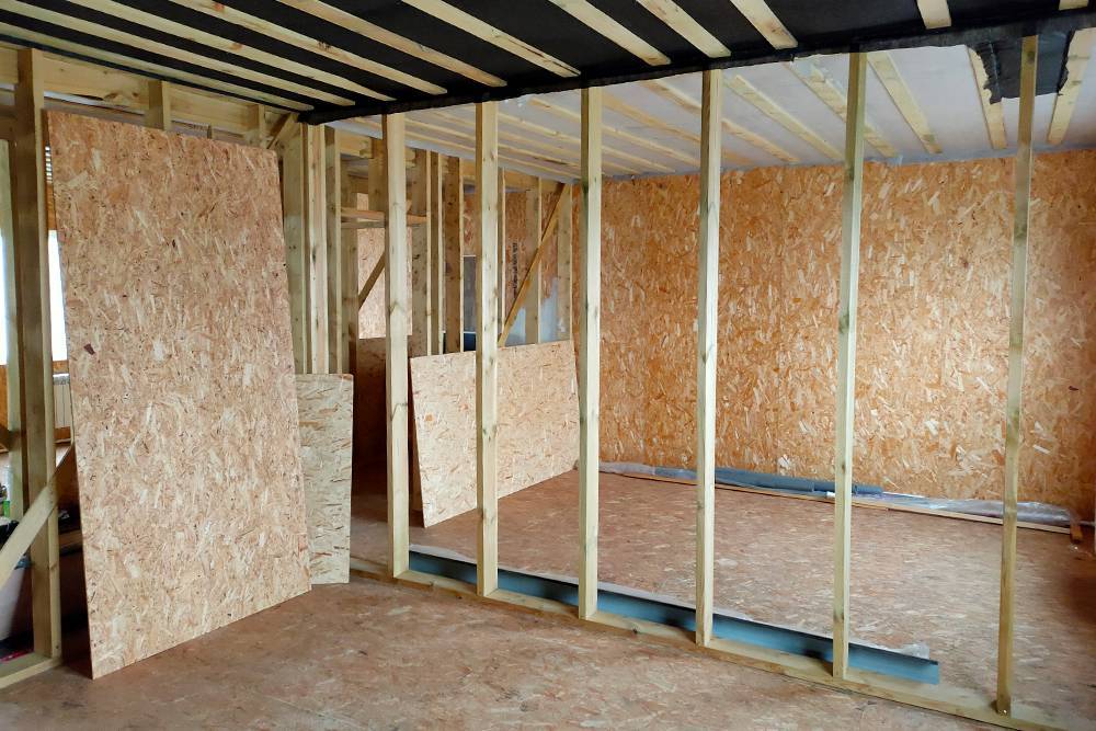 В доме есть свет, холодная вода, туалет, работает электричество. Но до того момента, когда сюда можно будет переехать, еще далеко. Например, нет привычных внутренних стен — пока это каркасные перегородки без отделки. Чтобы отделить одно помещение от другого, нужно будет заполнить пространство между перегородками минеральной ватой.