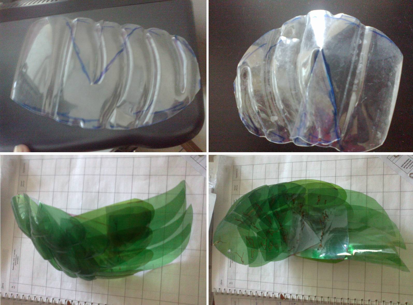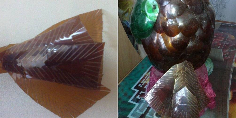 Шаг 3. Из бутылок зеленого цвета вырезаем заготовки для перьев крыльев. Соединяем их в полукруглой форме и крепим по бокам туловища.