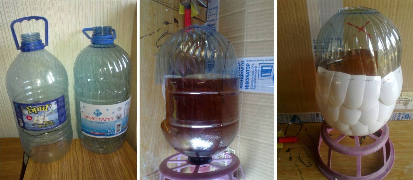 Шаг 1. Из двух пятилитровых бутылок делаем каркас туловища птицы. Для этого отрезаем от пластмассовых бутылей дно и соединяем между собой верхние части. Горлышко нижней бутылки закрепляем для устойчивости фигурки на предварительно подготовленной подставке.