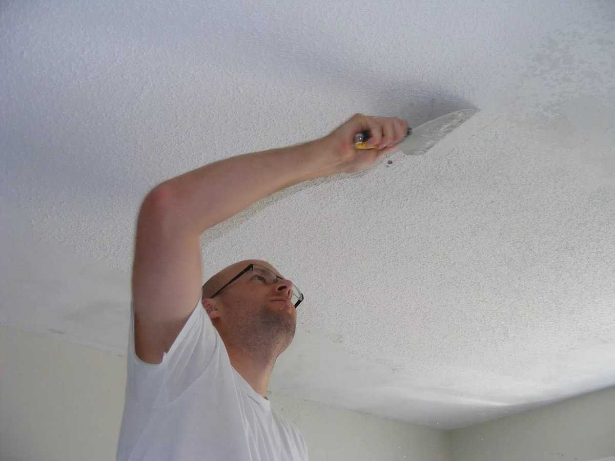 Считается самой популярной и заключается в том, что, используя острый шпатель, побелку нужно просто соскребать с потолка. Главные достоинства — относительная простота работ, возможность выполнять все без опыта, а также отсутствие необходимости покупать какое-то оборудование. Но метод очень пыльный, сопровождается большим количеством мусора. Периодически распыляйте в воздух немного воды, чтобы пыль оседала быстрее.
