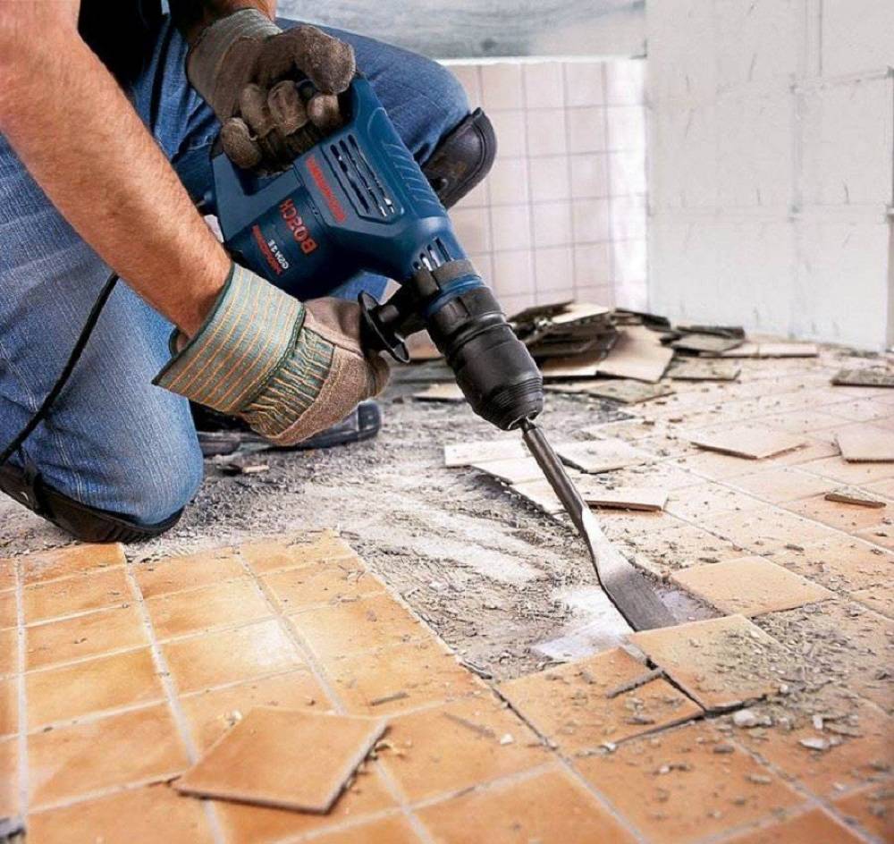 Снимаем кафель с пола зубилом, молотком, перфоратором