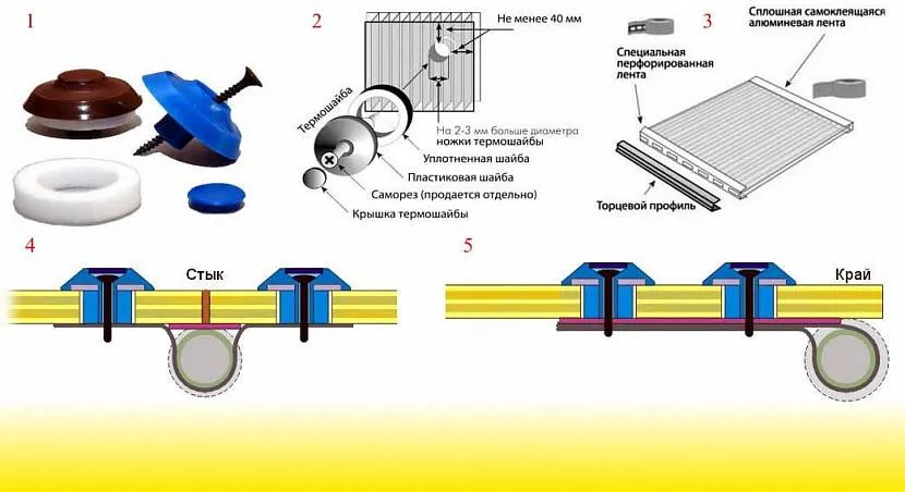 Для монтажа поликарбоната следует подобрать саморезы с резиновыми шайбами или крепить метизы через самодельные прокладки из резины.