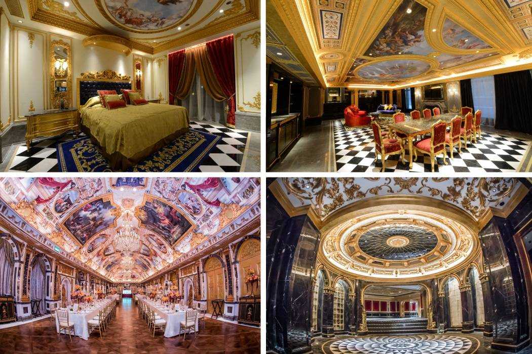 Пол в номере сделан из мрамора, потолки расписаны великолепными фресками с голубым тоном, на стенах золотой декор, фрески, алые портьеры и мягкая обивка. Номер на две спальни.