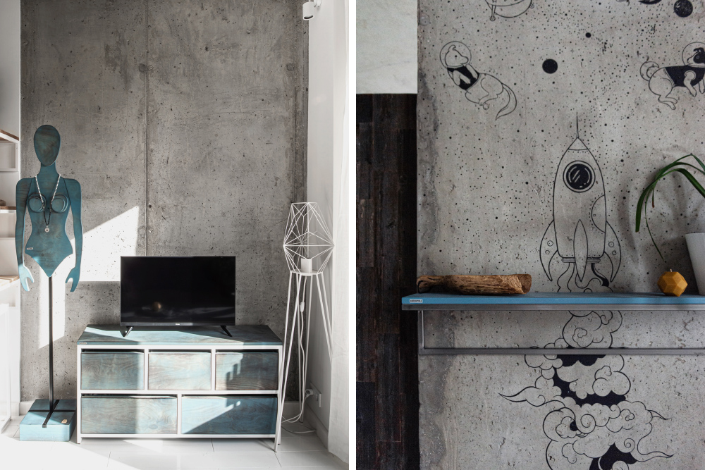 Бетон здорово смотрится на контрасте с белой ровной стеной. Иногда украшаем стены так называемыми интерьерными татуировками — они нарисованы вручную акрилом