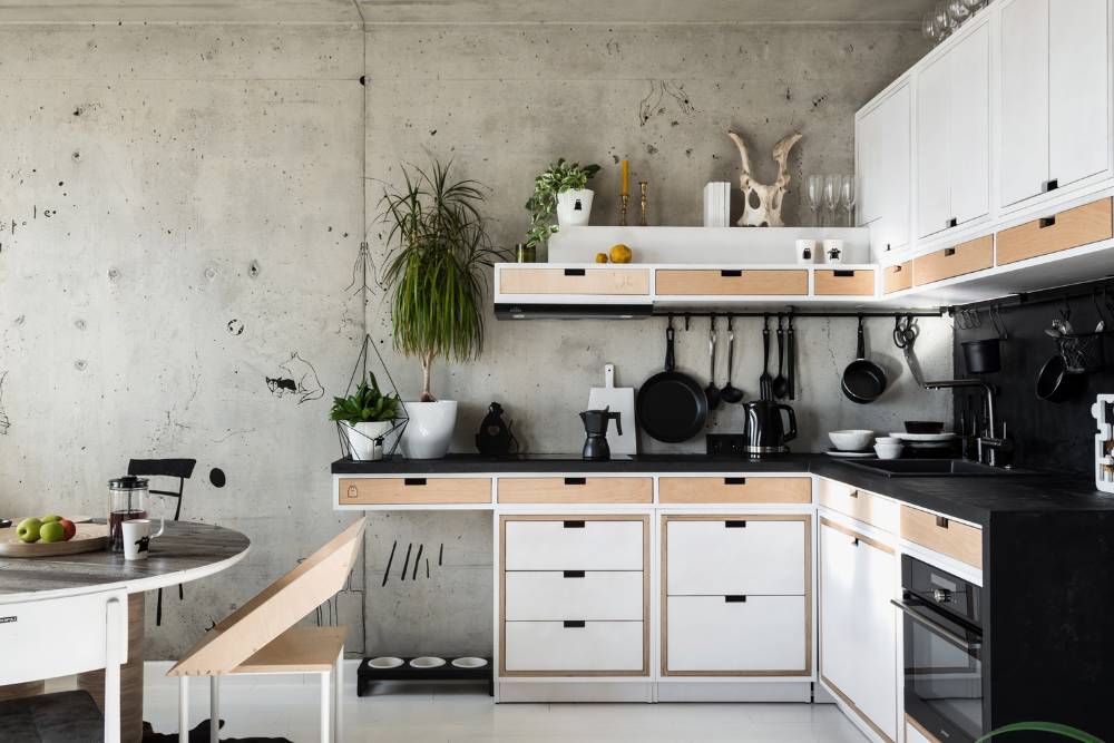 Сэкономить можно и на стенах, если естественная фактура радует глаз и не вызывает внутреннего диссонанса. Поверхность необходимо лишь покрыть грунтовкой. Для поддержания промышленного стиля следует использовать деревянную мебель, металлические элементы и яркий декор.