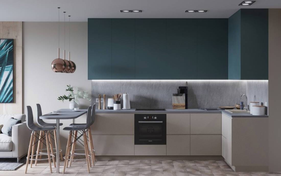 При выборе фасадов кухни уместны варианты в шпоне, пластике и лаке базовых цветов.