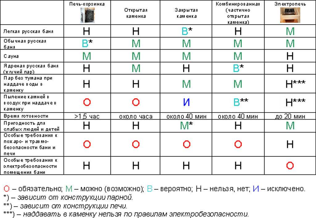 Установка банной печи начинается с ее выбора. Современные печи для бани далеко не примитивные буржуйки из бочки или трубы с ящиком для камней. Сейчас даже искушенные гурманы-парильщики признают, что русский пар от хорошего Вулкана или Гефеста практически не уступает таковому от кирпичной печи. Любители сауны давно сошлись на том, что фирменные финские банные печи бьют «кирпич» по всем статьям. Но что касается эргономики и медико-санитарных качеств банных печей, то тут производители все как один ограничиваются заявлениями, что их печка лучшая, а дело только за ценой. Поэтому на рис. дана сводная таблица потребительских качеств банных печей разных конструкций. Ориентируясь по ней, можно подобрать тип печи под свои потребности, а там уж смотреть, что из него по стоимости подойдет.