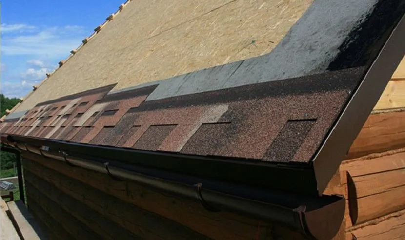 После того, как подкладка под первый слой стеклорубероида или гонты был приклеен на кровельный скат, требуется прибить ветровую планку. Под горизонтальную полку требуется наносить клеевой слой и прикрепить стяжками. Уже на этапе настилания покрытия кровли приклеивают на ветровую защиту по уровням пружины. В местах стыкования полотна с карнизной накладкой профиль из металла ветровой планки укладывают поверх карниза, в верхней части планку требуется запускать под коньковый треугольник.