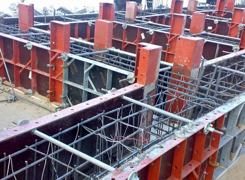 При строительстве правильной конструкции в первую очередь необходимо продумать её конструктив и все необходимые силовые элементы (распоры, укосины, стяжки). Ведь одно дело: лить ленту высотой от земли в 30-40 см, и совсем другое – заливать стенки подвала высотой в 2.5 метра. Особенно, если бетон подаётся при помощи бетононасоса.
