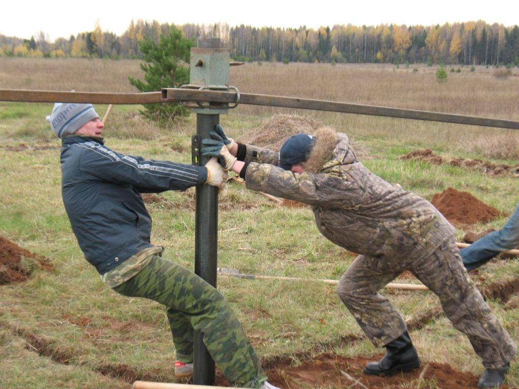 - По разметке нужно ввинтить опоры в грунт. Для этой цели в верхней части сваи выполнены отверстия – в них вставляют лом или трубы (зависит от диаметра свай), они и будут рычагами для закручивания.