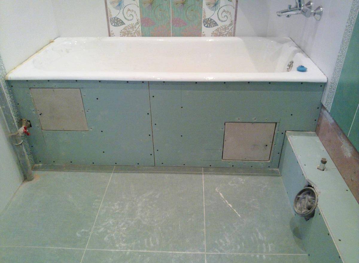 Если на стенах большие неровности, то для их выравнивания используется гипсокартон, который будет способен выдержать влажность в комнате. Он крепится на профильную каркасную конструкцию.