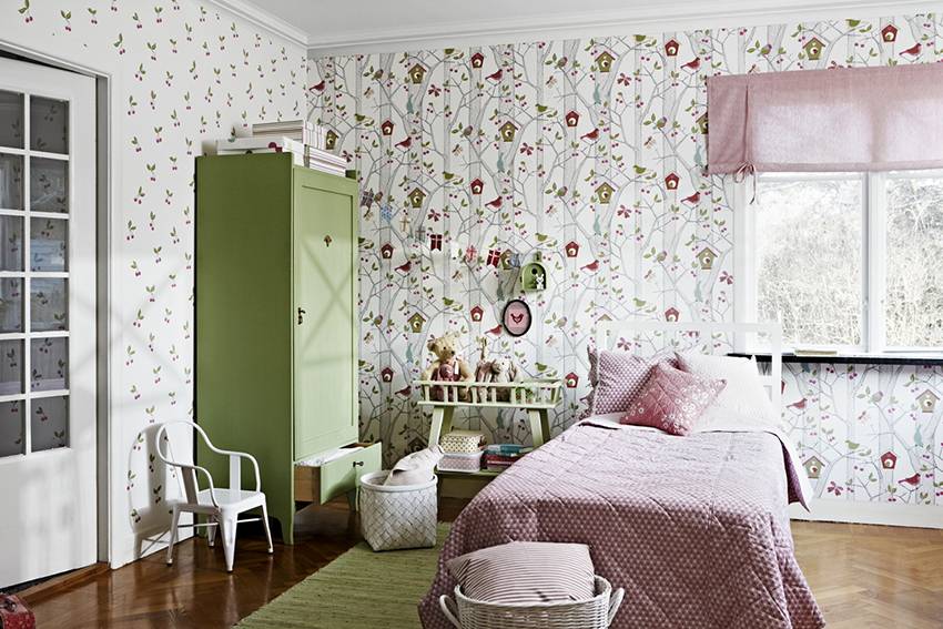 Для спальни девочки будут подходить обои с ягодным вертикальным рисунком – клубникой и малиной. Популярна и тропическая тема: изображения пальм и океана, желто-зеленая цветовая гамма. Но чтобы интерьер не получился перегруженным лишними деталями, обоями с крупным рисунком или пейзажем лучше украшать одну стену, а остальные оставить однотонными.