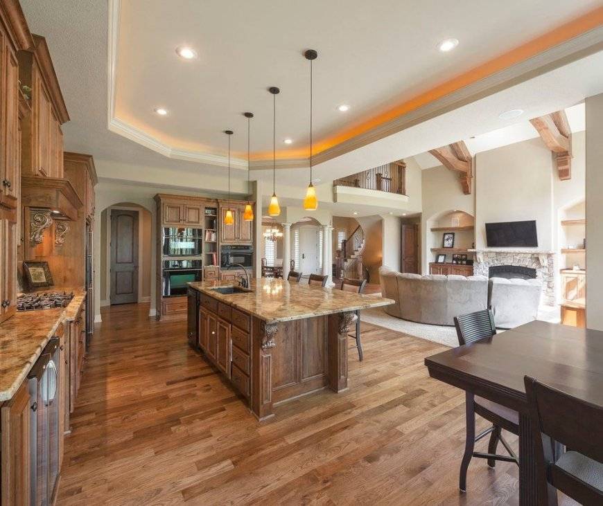 Традиционно размещение зон идет в таком порядке: кухня, затем столовая и гостиная. Если форма помещения трапециевидная, то допустимо расположить столовую и гостиную параллельно рабочей зоне. Переходные участки оформляют арками, колоннами или порталами. В классическом интерьере категорически не рекомендуют обеденную зону делать в одном помещении с рабочей.
