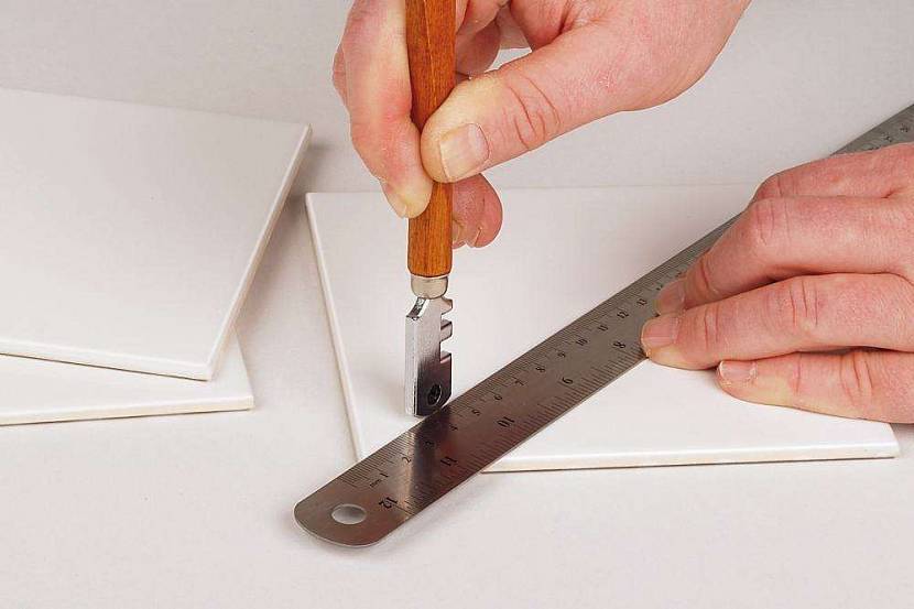 В работе будет нужна ровная планка. Ее прикладывают по линии разреза и надежно удерживают на поверхности. Линейка не позволит отпрыгнуть в сторону резцу. В процессе разрезающий инструмент прижимают к основе с усилием, чтобы создать более глубокую бороздку на плитке. Это стараются осуществить за одно прохождение, в противном случае отрезанный кусок будет неровным.