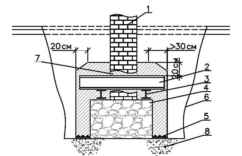 Усиление фундамента двухсторонней банкеткой: 1 – существующий фундамент; 2 – несущая балка банкета; 3 – разгрузочные балки; 4 – банкет из монолитного бетона; 5 – арматурные сетки; 6 – откосы котлована; 7 – штраба в фундаменте для установки балки; 8 – щебеночное уплотнение основания.