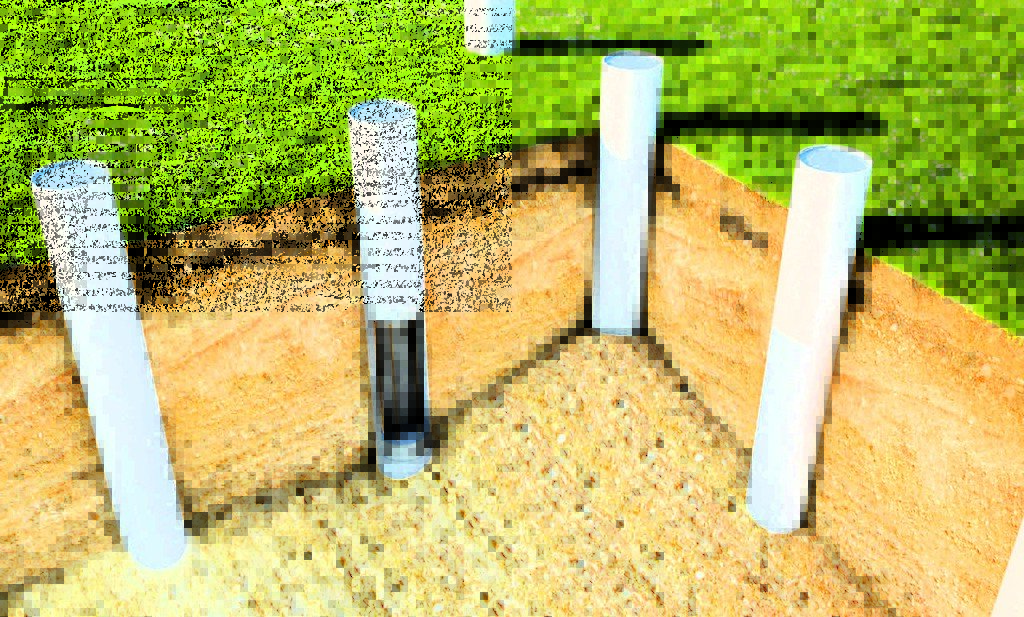 Использование свайного метода предполагает установку железобетонных столбов по периметру предполагаемой конструкции.