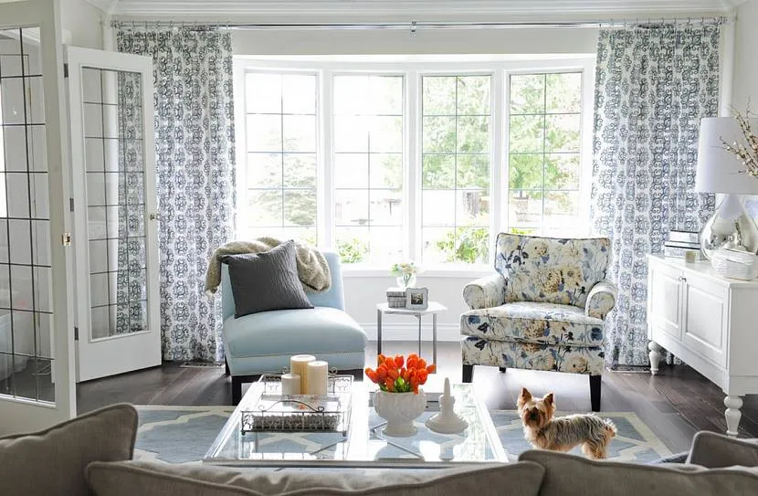 Стильно выглядят графические принты, картины в стиле абстракционизма. Подбирают обивку, шторы, мягкую мебель с геометрическими рисунками или цветочным орнаментом.
