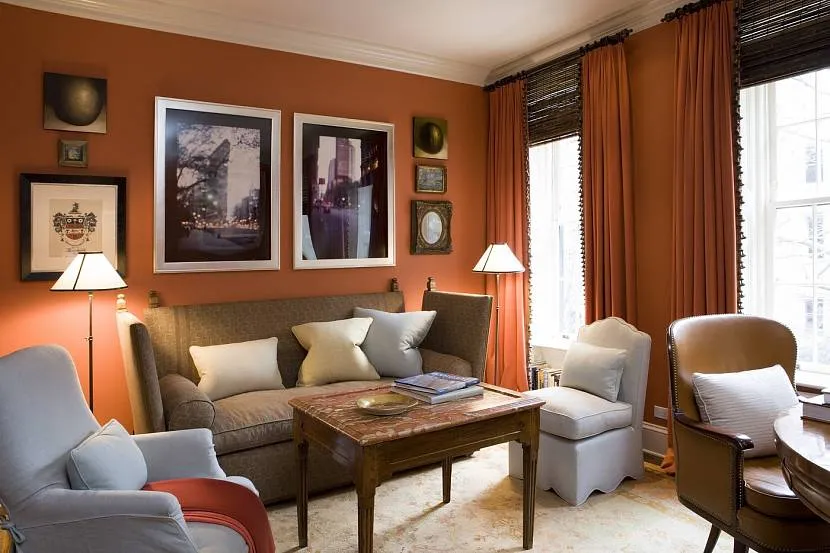 Отделка стен и портьеры кирпичного тона разбавлены коричневым и серымИсточник dizainvfoto.ru